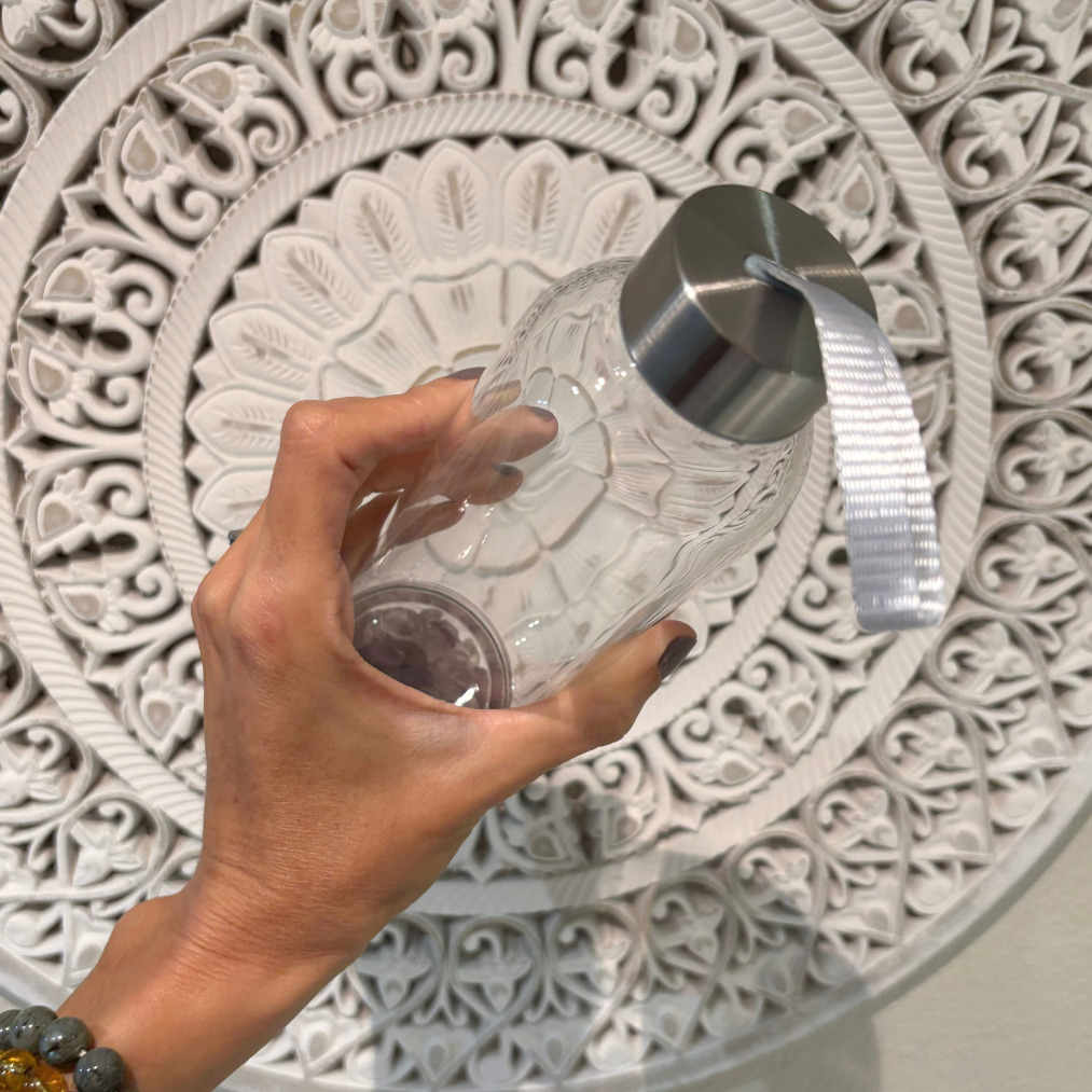 Mineralized water bottle: in this case with natural amethyst crystals inside.