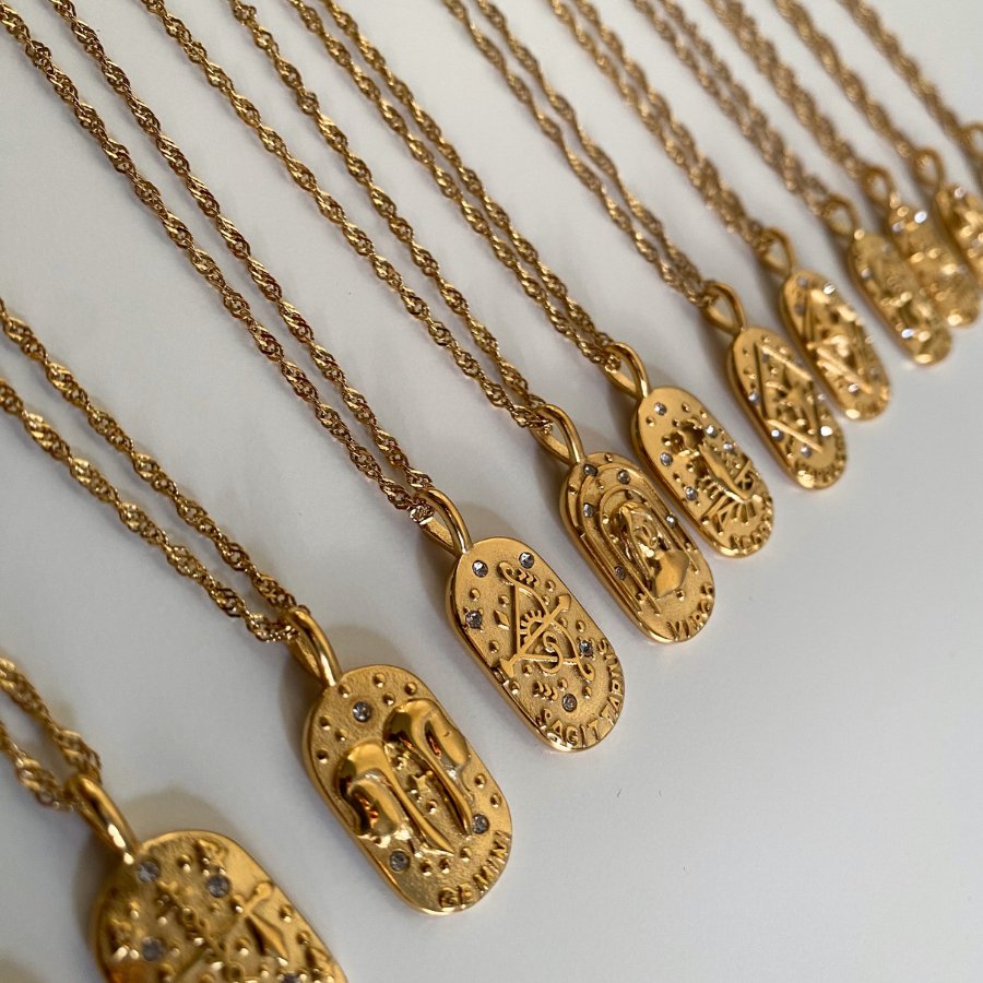 Enjoy these 18k gold plated necklaces of the 12 zodiac signs.
