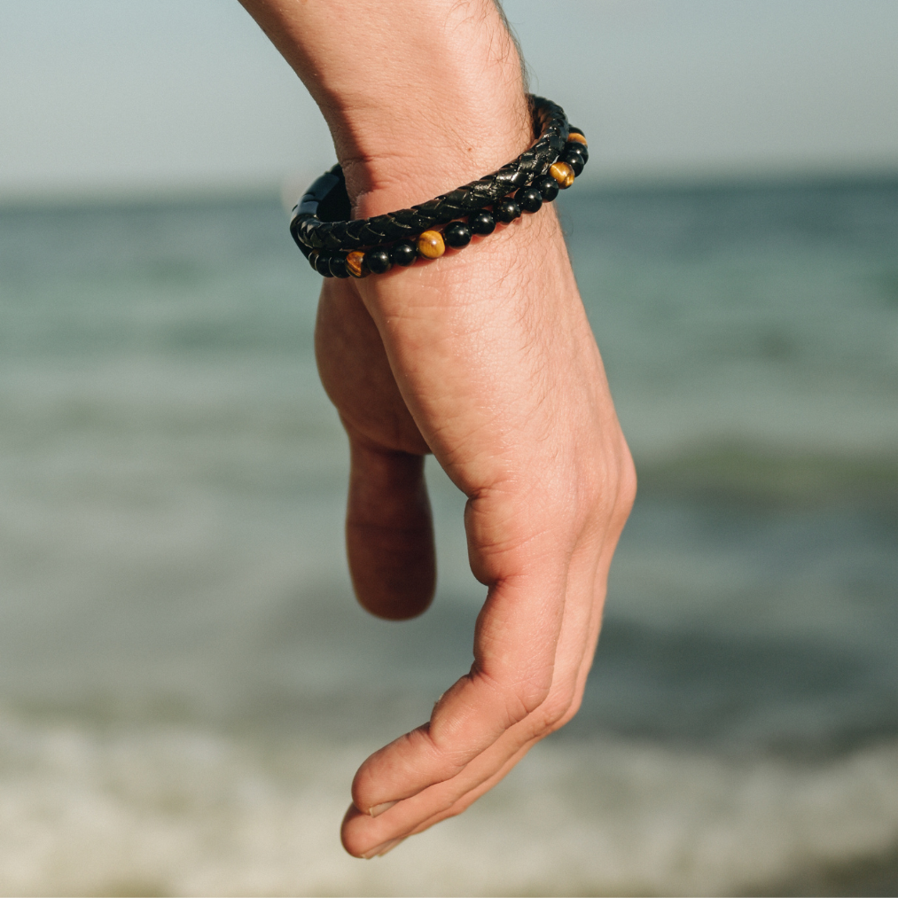 Pulsera de fuerza, prosperidad y protección. Pulsera doble que combina una tira con cristales naturales: ojo de tigre y ónix, y otra de cuero trenzado de color negro.