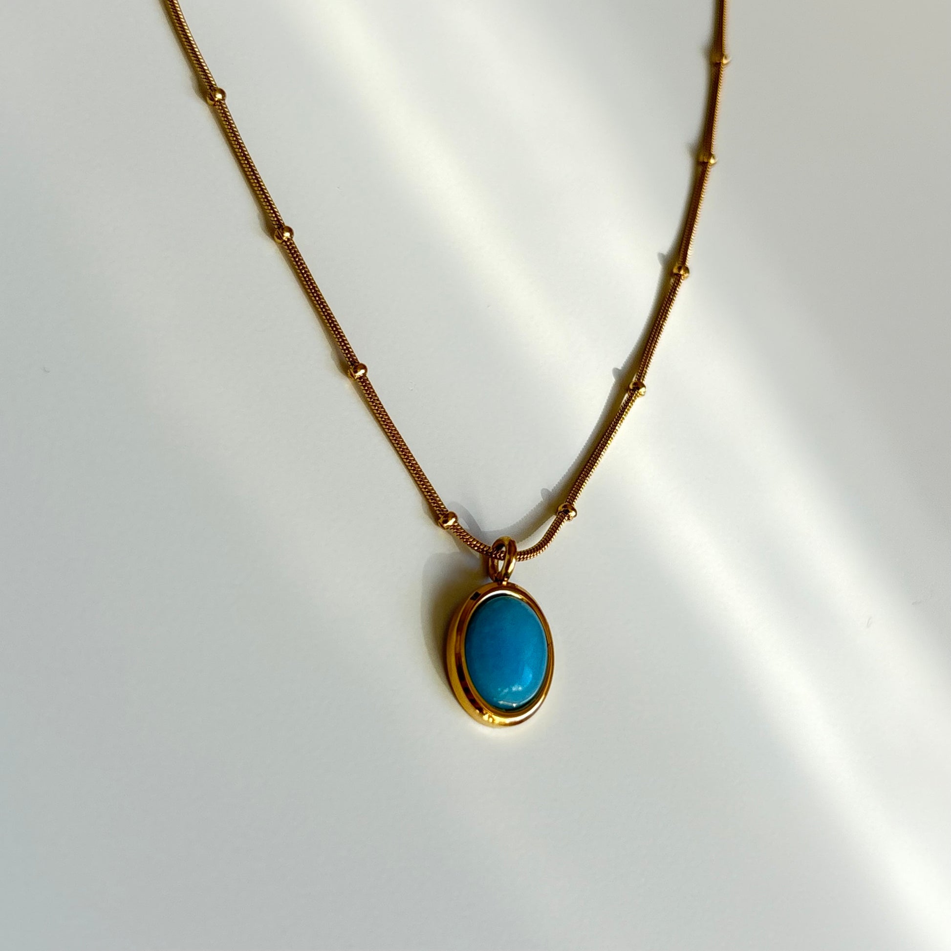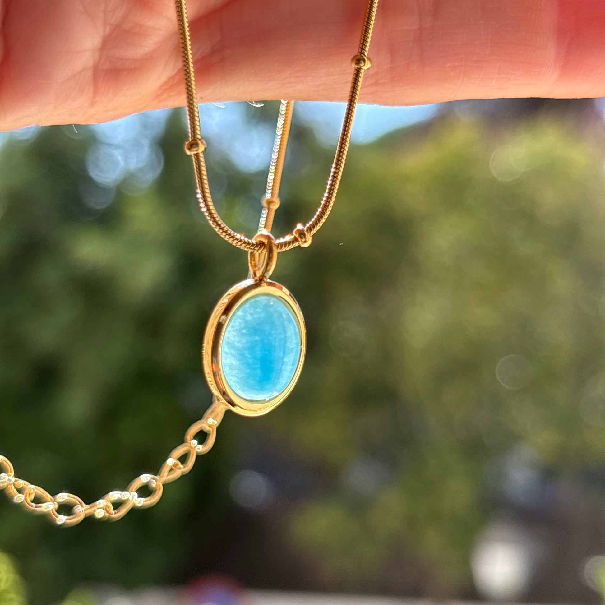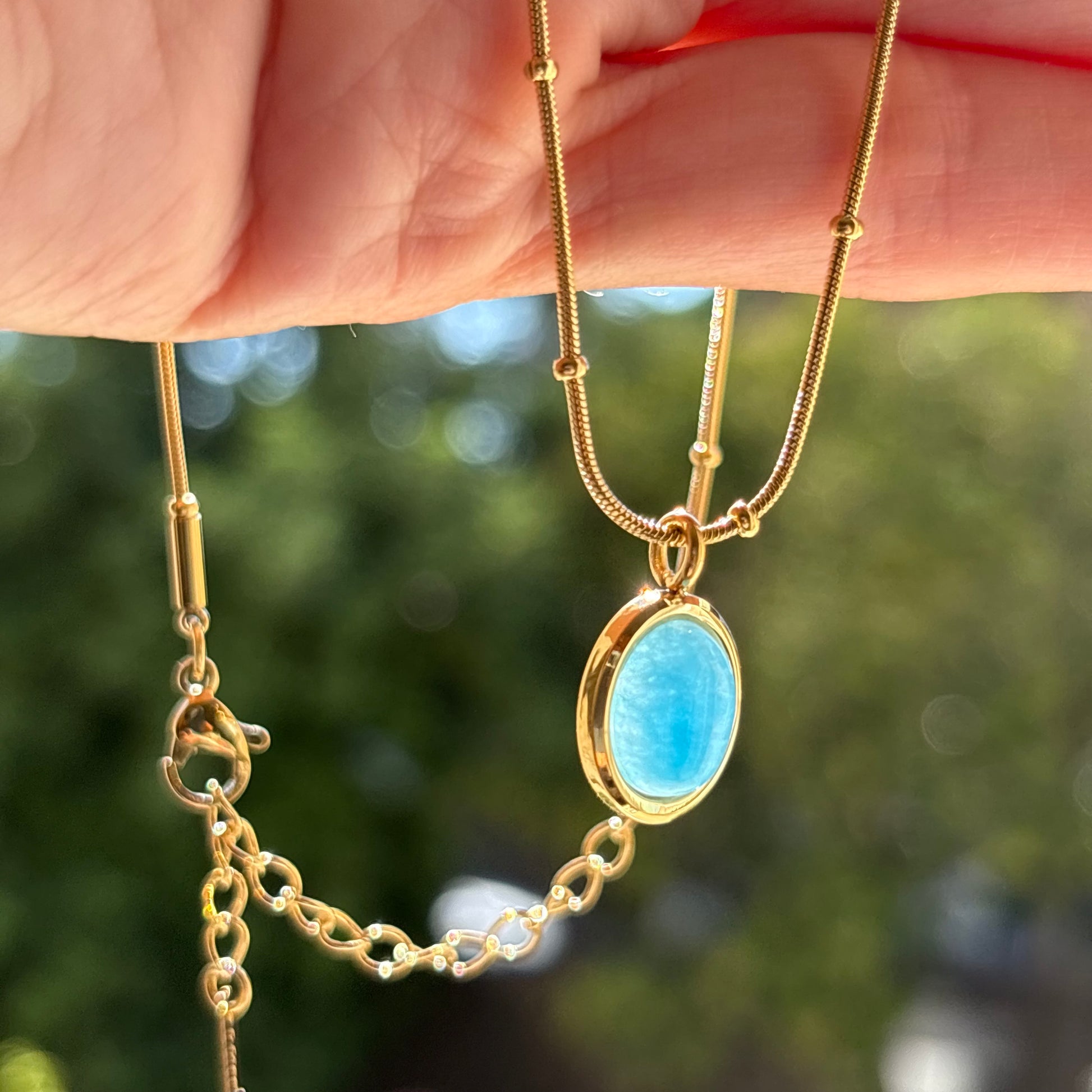 Collar con dije oval de aguamarinan natural, bañado en oro 18k.