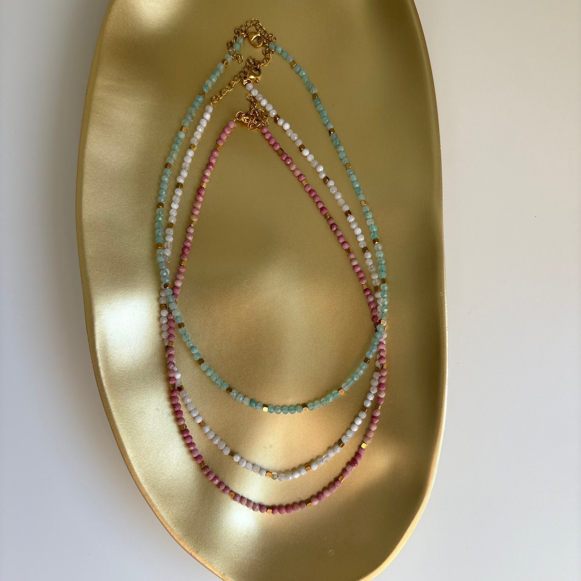 Cada pieza está elaborada con piedras naturales facetadas de 3 mm, combinadas con detalles en acero inoxidable hipoalergénico, ideales para el uso diario y para todo tipo de piel.