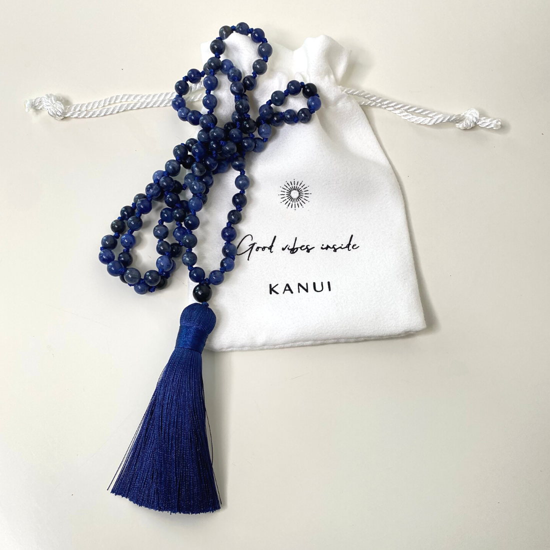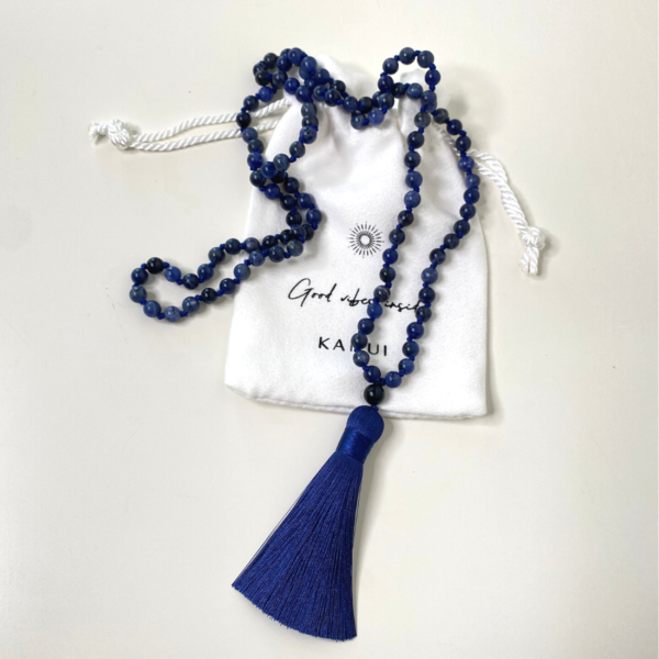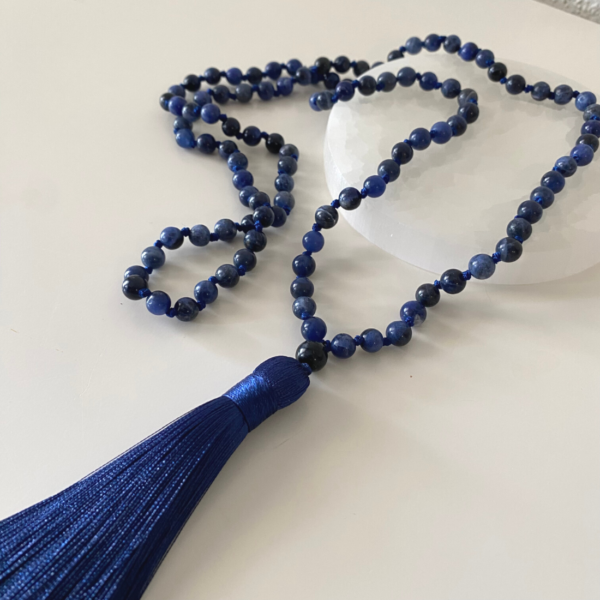 Colar Japa mala com 108 contas sodalita natural: Melhora a intuição, a comunicação, a criatividade e o bem-estar emocional.